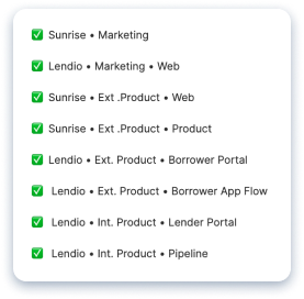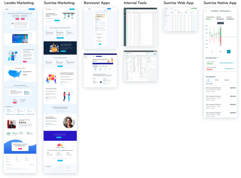 Once we had gathered several iterations of feedback from designers, developers, and marketing on the styles and components Jessica and I had developed, I built a page from every experience using our proposed styles and components. This included experiences across Lendio and Sunrise—both internal and external-facing apps—to show stakeholders how the system could work well for their experience.