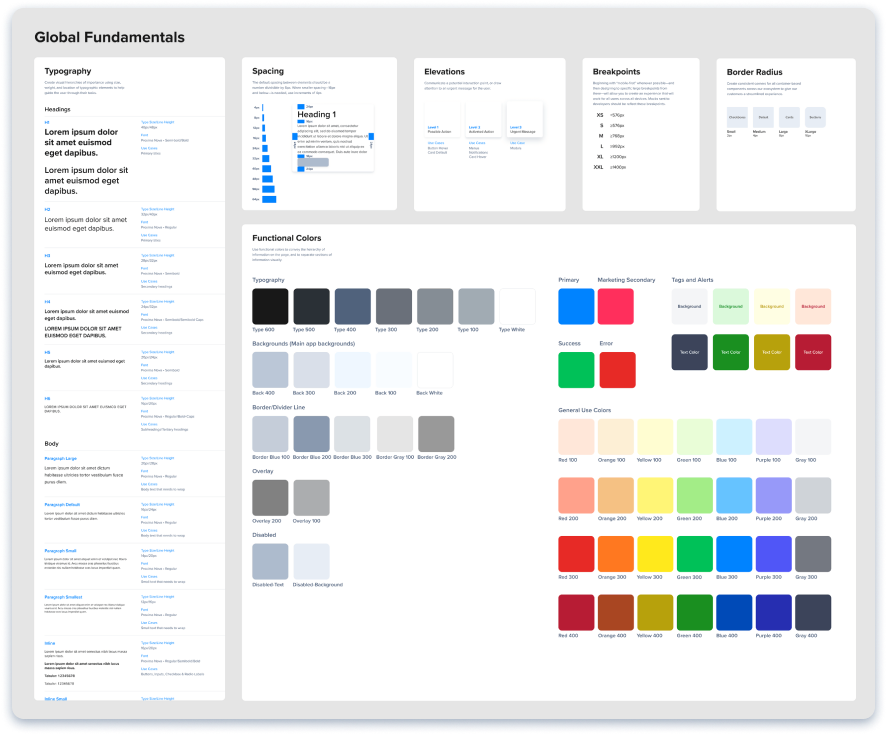 To do this, we created a plan to get alignment on the basics: typography & grid, spacing, buttons, elevations, modals, breakpoints, and border radius.